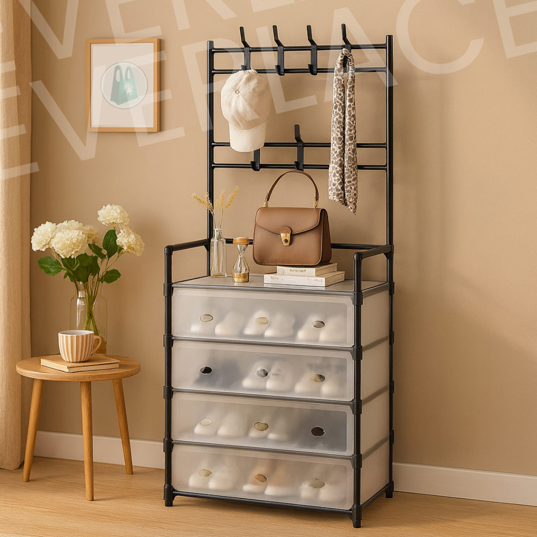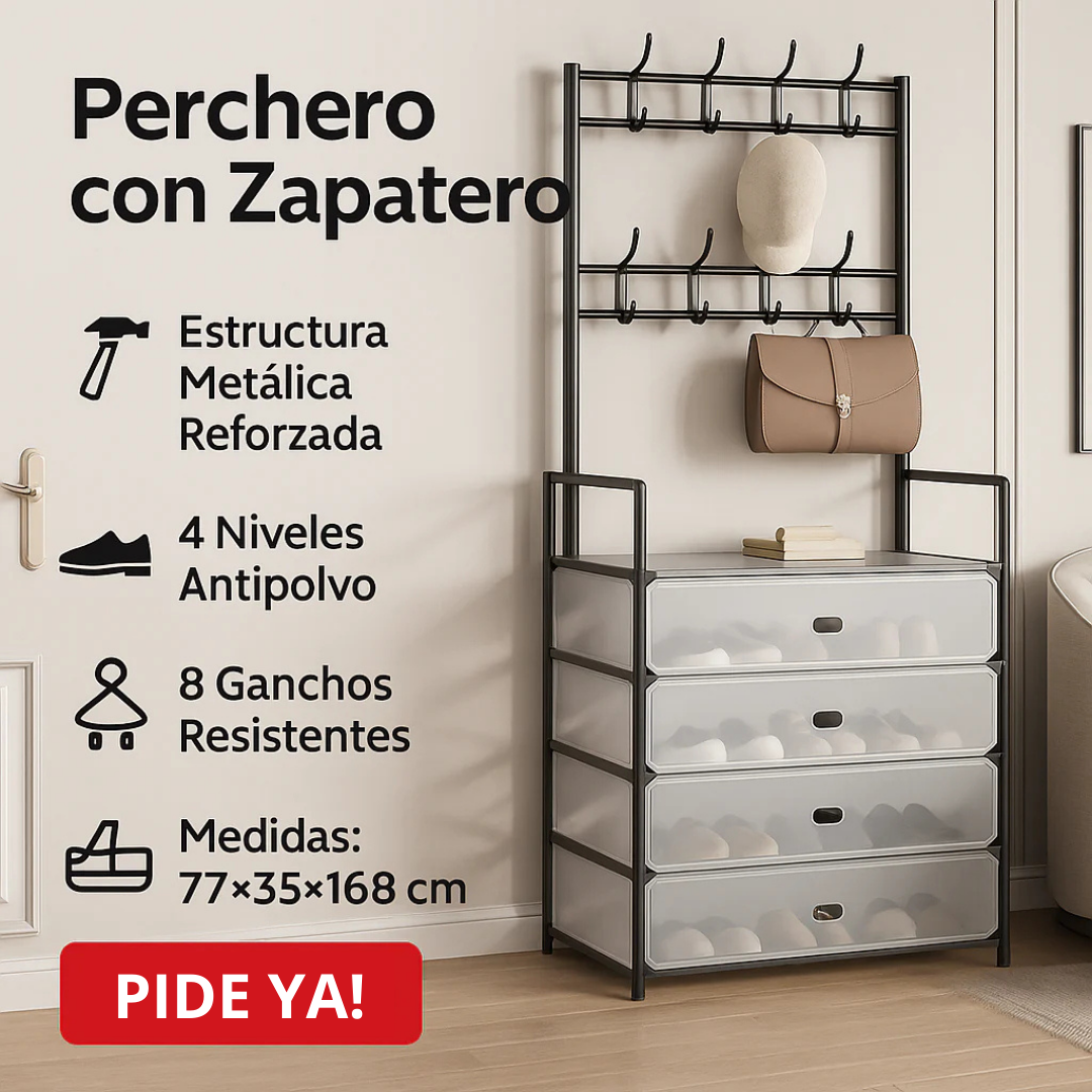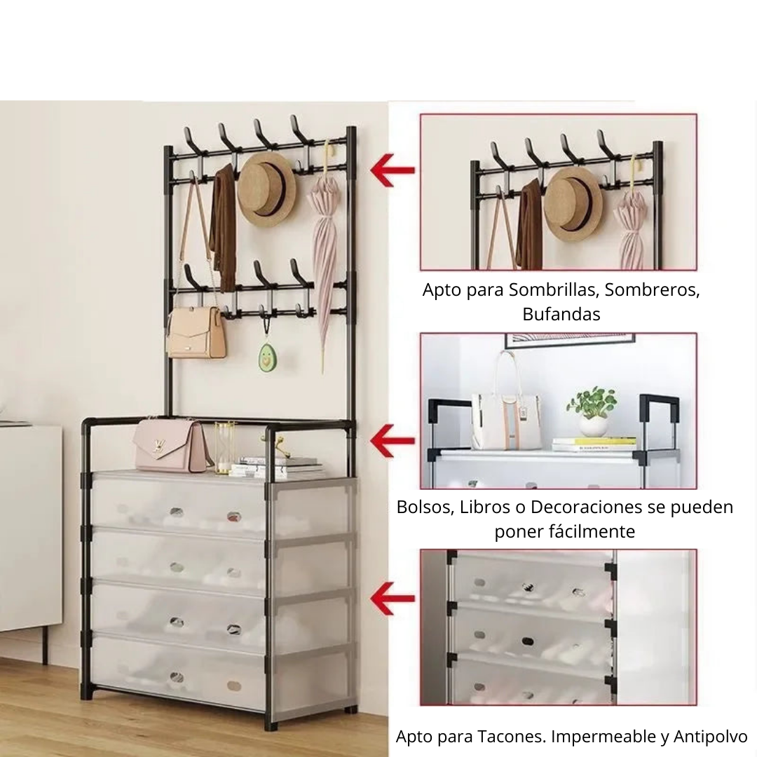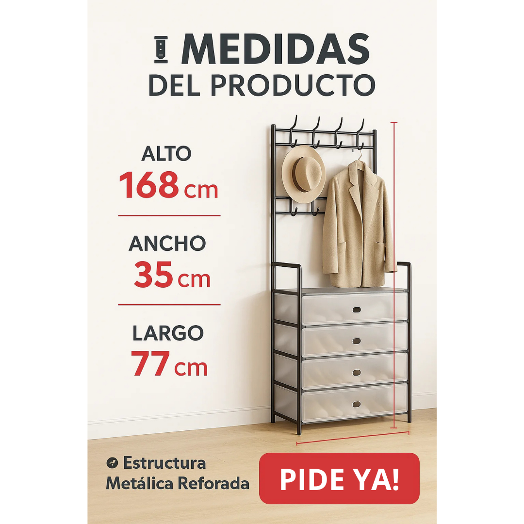 Con el Perchero Metálico Multifuncional con Zapatero tendrás en un solo lugar: perchero, zapatero y repisas de almacenamiento. Perfecto para espacios reducidos, apartamentos, habitaciones estudiantiles o simplemente para quienes buscan orden y estilo sin complicaciones.